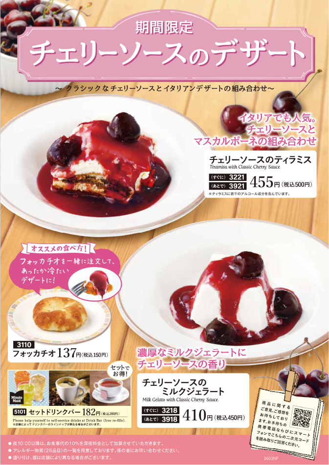 ミルクジェラートとティラミスに、甘酸っぱいチェリーソースを合わせました。今だけの味を、ぜひサイゼリヤで。