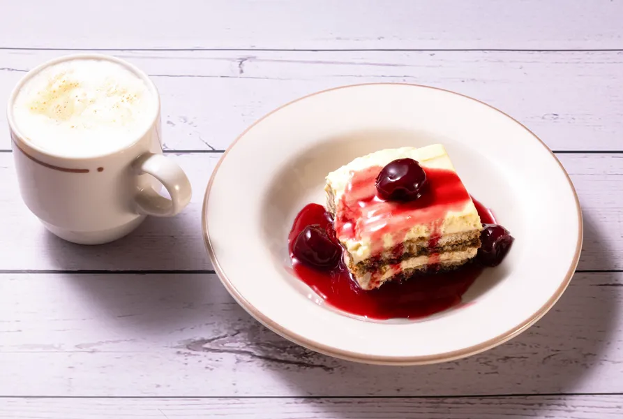カプチーノに合わせるのもおすすめ。ミルクのまろやかさにチェリーソースの酸味がアクセントとなります。