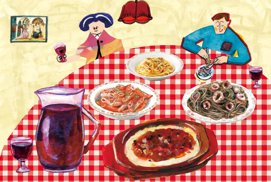 パスタや米料理などから好きな一品を選びます。料理の塩味で、のどが渇き、ワインと合わせれば、ワインも料理も一層おいしくなります。