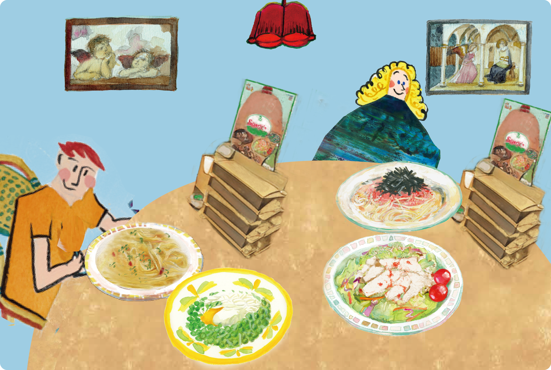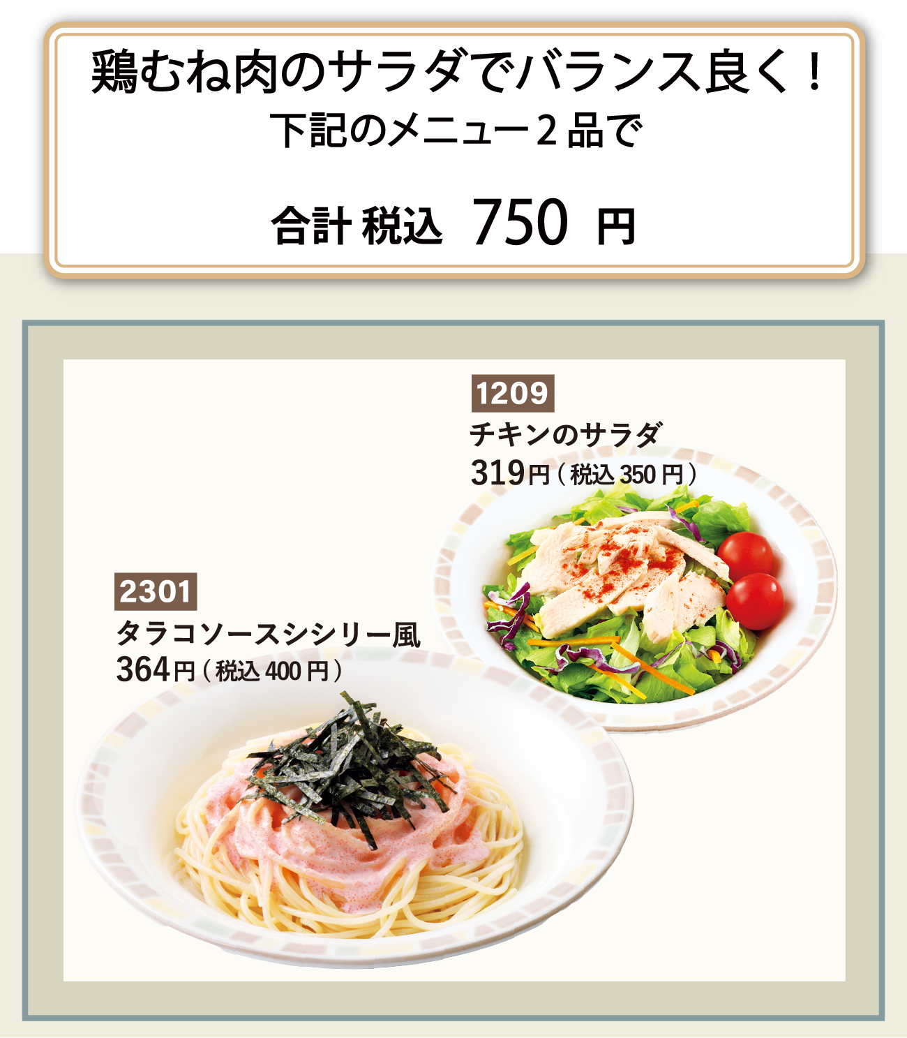 パスタに野菜料理を追加してバランスの良い食事をどうぞ。