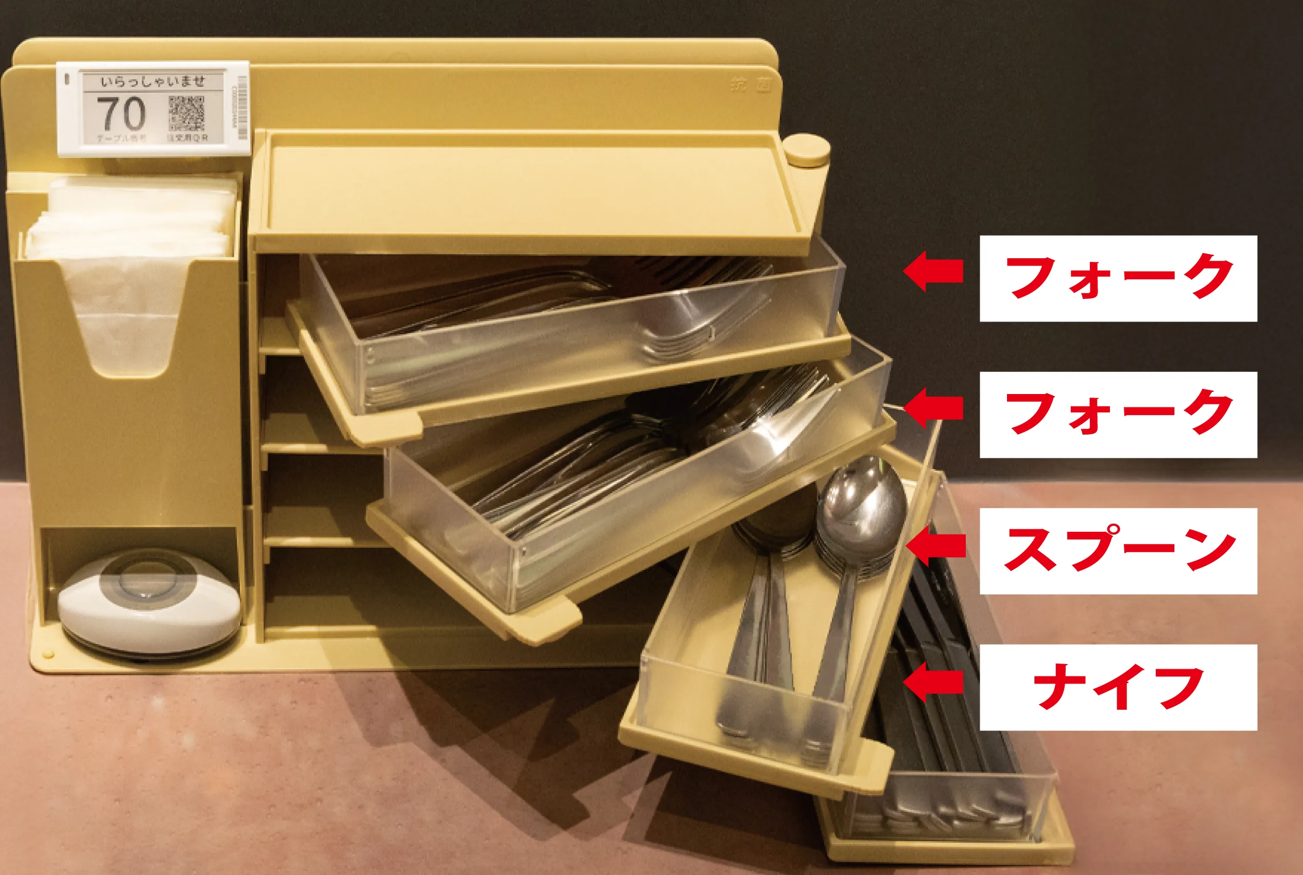 上から1段目と2段目がフォーク、3段目がスプーン、一番下がナイフです。