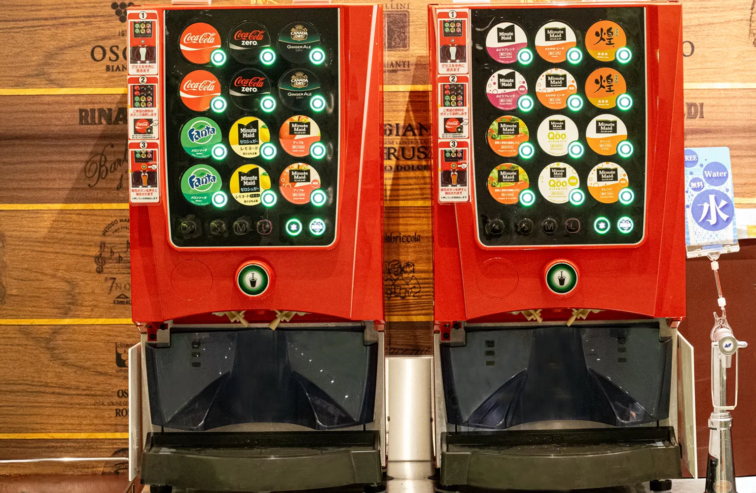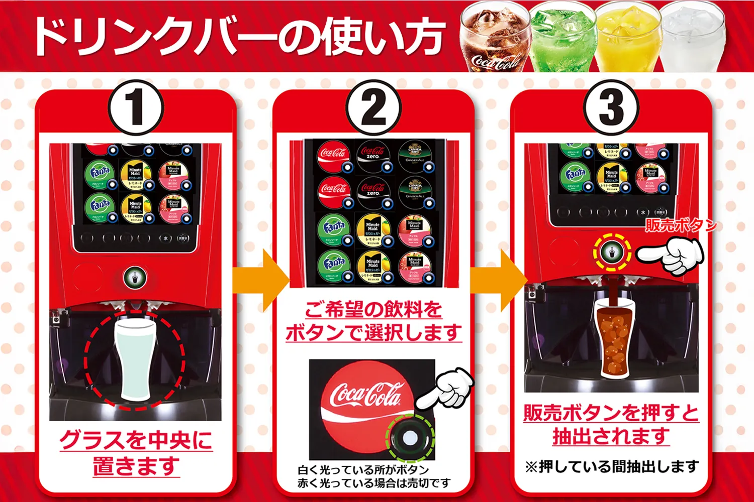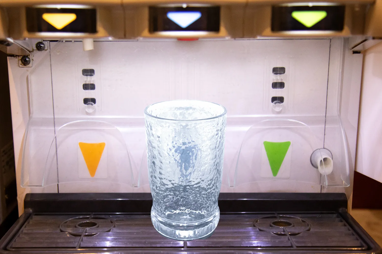 お好みでグラスに氷を入れ、飲みたいドリンクの下のガイドにグラスを置いて商品のボタンを押してください。