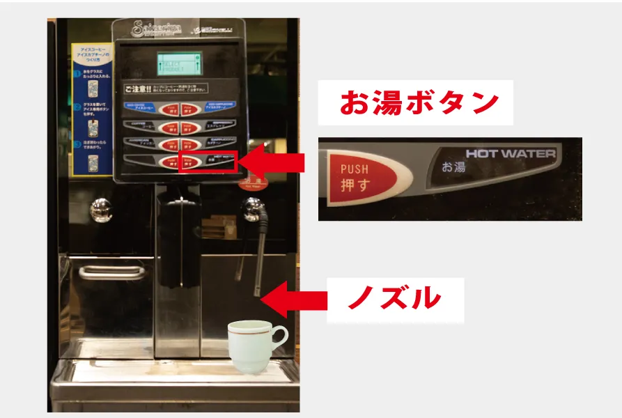 お好みのティーバッグをカップに入れて、コーヒーマシンの細いノズルの下に置いてお湯ボタンを押してください。