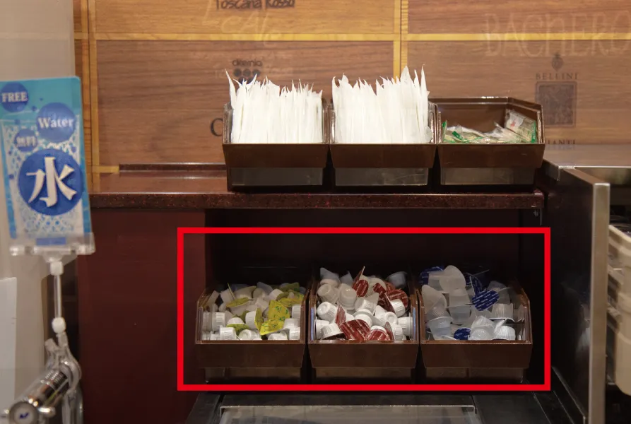 ■ ポーションミルク、ガムシロップ、スティックシュガー、レモンポーション