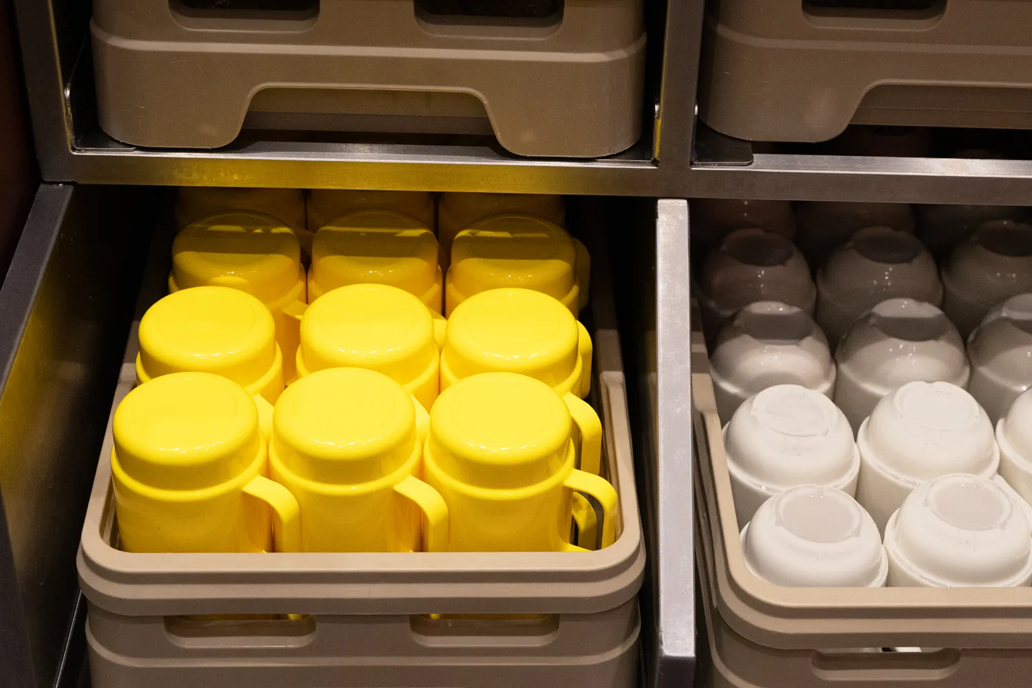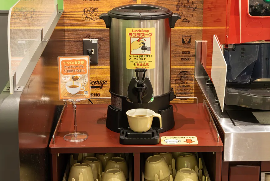 店内のスープスタンドにある専用カップに注いでお召し上がりください。