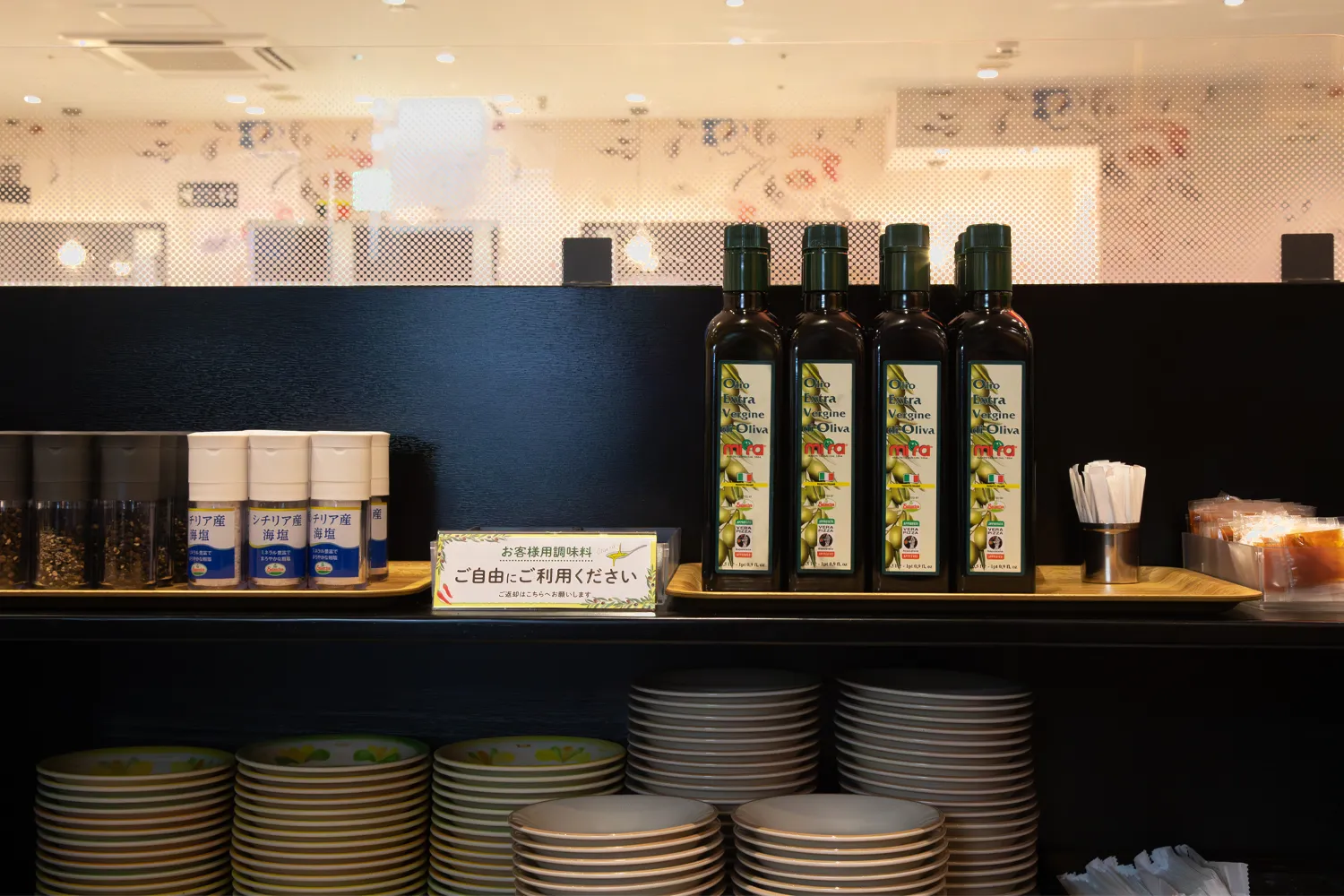 オリーブオイル、シチリア海塩、ブラックペッパー、ホットソース(ボトルまたはミニパウチ)をご用意しています。ご自由にご利用ください。