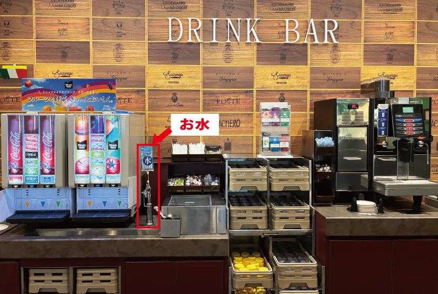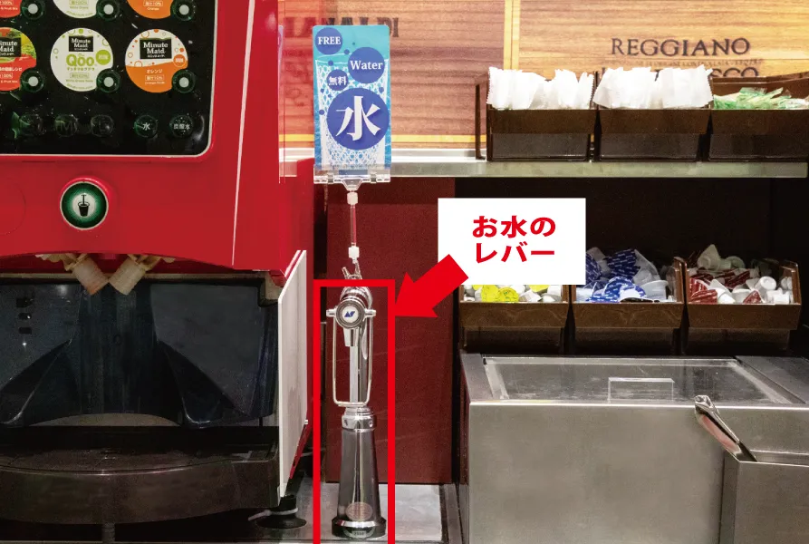 ドリンクカウンターにあるグラスを手に取り、お水のレバーをグラスで押して注いでください。