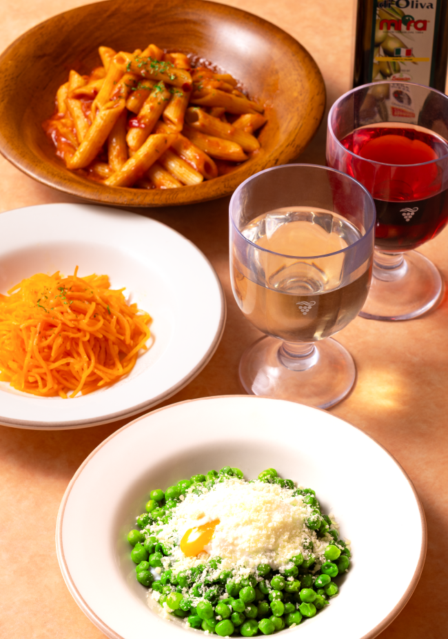 青豆本来の自然な甘みが楽しめるよう、早採りした「ベビーピー」を使用。チーズと半熟卵のコクが「ベビーピー」の甘みをさらに引き立てます。イタリア料理でも春には青豆が登場します。