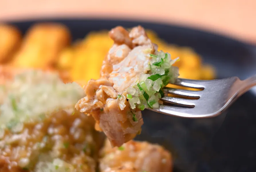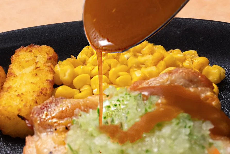 イタリア伝統の“ディアボラ風”をヒントにした野菜ソースで、さっぱりと食べられる健康的なおいしさです。最後に、醤油ベースの特製ガルムソースをかけて、香り良く仕上げています。ライスによく合う、一番人気の肉料理です。